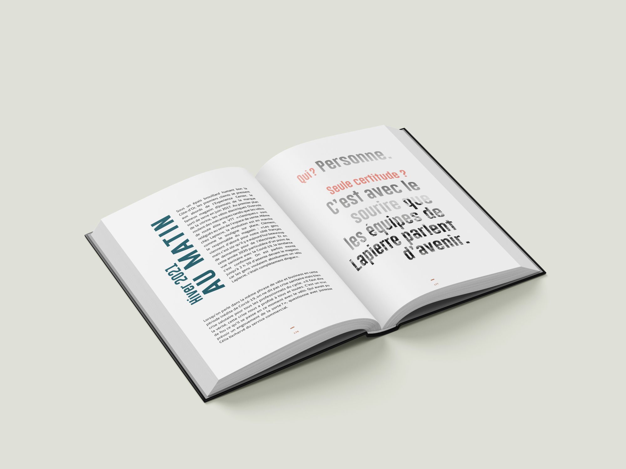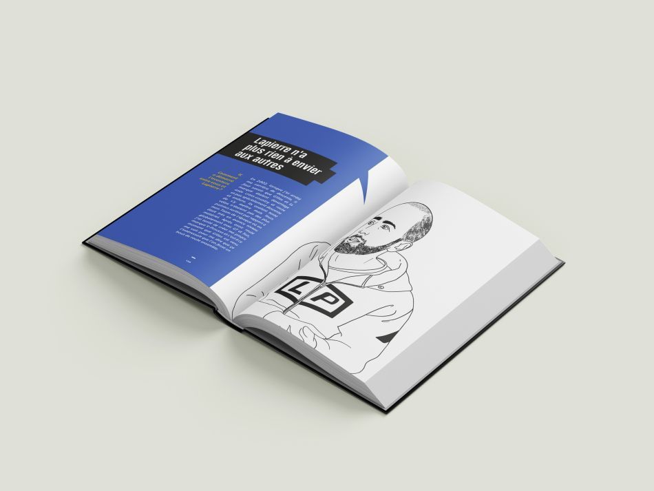 Chaque double page a été pensée comme une expérience graphique unique, mêlant photos historiques, visuels techniques, témoignages et éléments narratifs. L’objectif était de créer un ouvrage vivant, vibrant, et fidèle à l’énergie de Lapierre. Notre équipe a travaillé sur un rythme visuel varié pour maintenir l’attention du lecteur tout au long des 240 pages, en alternant pleines pages, jeux typographiques, compositions dynamiques et respirations graphiques.