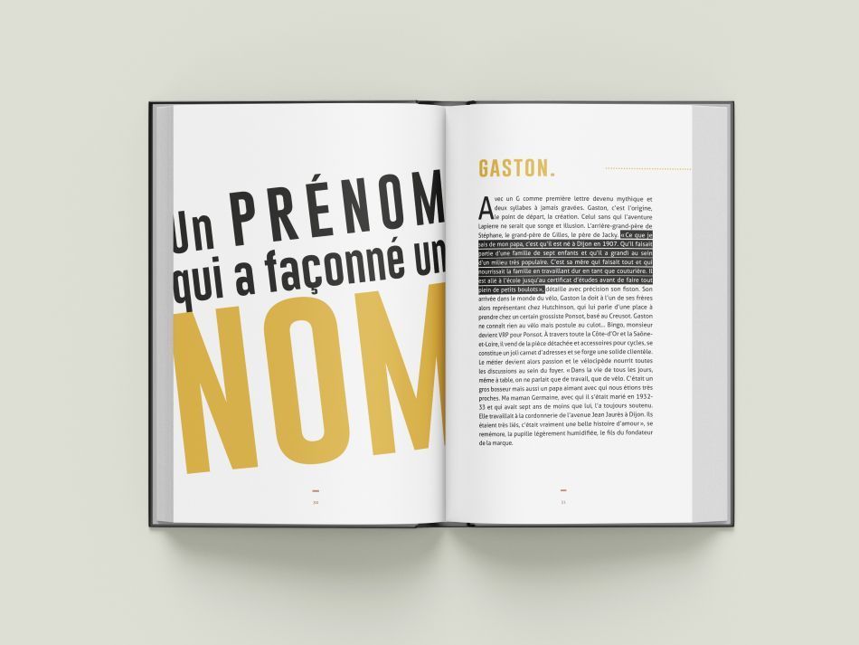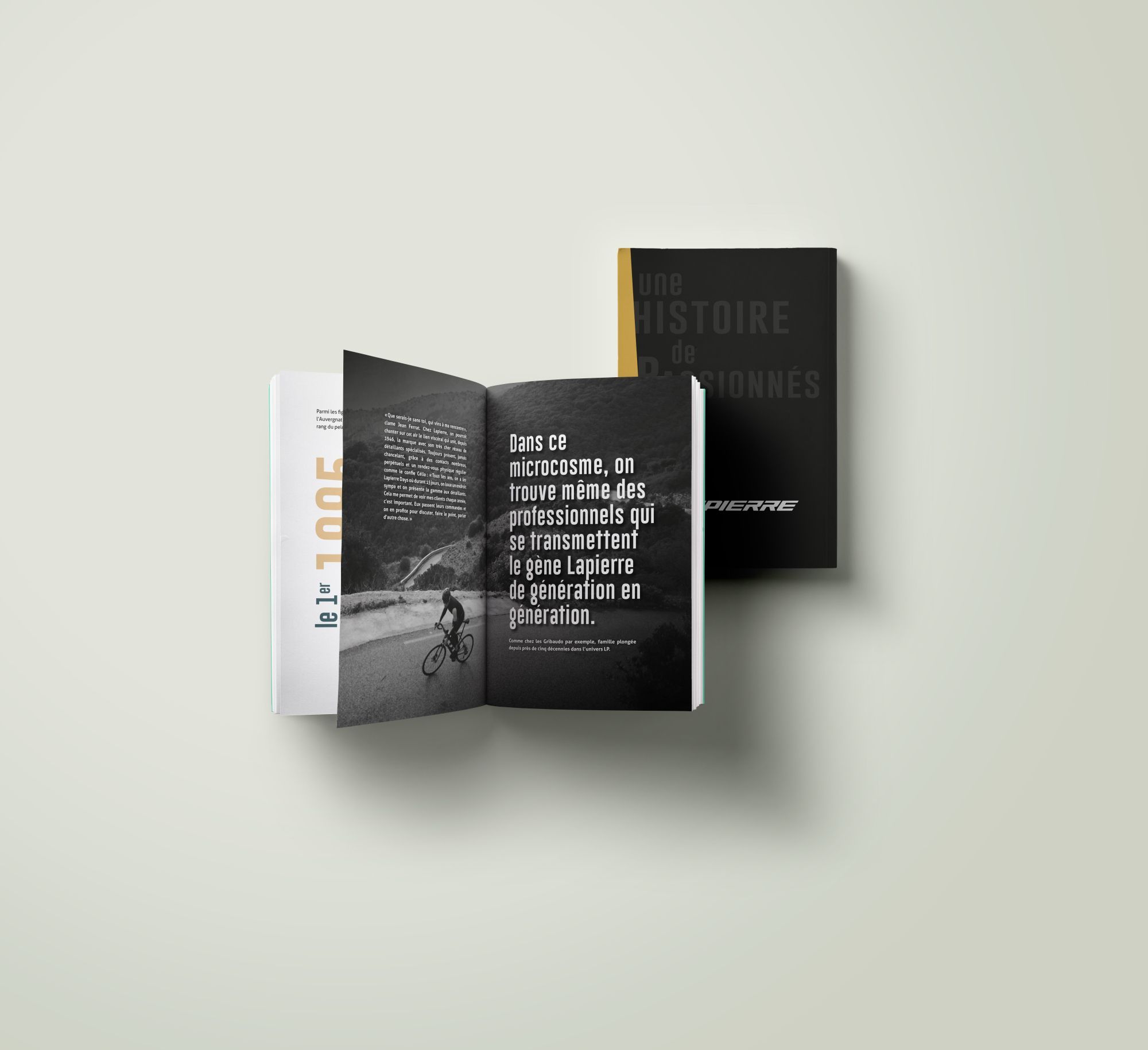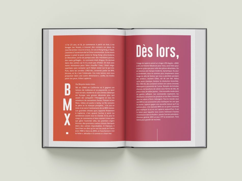Grâce à Scribeuse, notre partenaire éditorial, nous avons eu le privilège de concevoir et de mettre en page un livre de 240 pages retraçant l’aventure Lapierre. Un projet d’envergure, aussi exigeant que passionnant, qui nous a permis d’explorer les multiples facettes de l’univers de la marque : ses débuts, ses innovations, ses valeurs, ses figures emblématiques et son influence durable dans le monde du vélo.